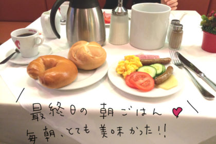最後の朝、いつものようにビュッフェでパンとハムやトマトを食べ、荷物をまとめてフロントへ。 最後に、素敵なロビーのソファに座って、ホ...