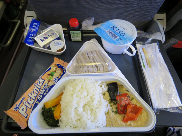 機内食はというと、、乗り物酔いを心配してほとんど食べない私。オットは完食。
