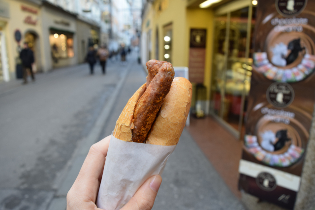 そして出来立て熱々を受け取る。ゲトライトガッセに戻って、食べながら歩く。