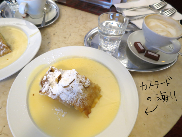 そうこうしているうちに、アプフェルシュトゥルーデルとメランジェが来る。ひ、ひゃ~、ちょっと、思っていたのと違ってた・・!アプフェルシュトゥルーデルが、温かい大量のカスタードクリームの上に置いてある・・。このカスタードクリームが半端ない量。。まるでカスタードの海。