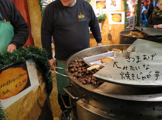 美味しそうな、ジャガイモをつぶして平べったくして焼いたような、見た目、さつま揚げのような食べ物を売っていたので(焼き栗と一緒に売っている)それを頼んでみました。