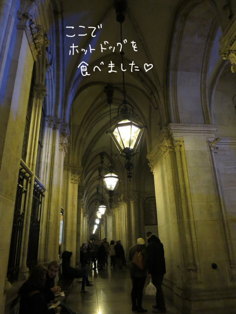 左右に広がる長い廊下。高い天井からは、雰囲気のあるランプが吊られている。そのランプだけの灯りのほの暗さの中、目の前に広がるクリスマスマーケットを見ながら、ホットドッグを食べた。お味は・・、うーーん、出来立てじゃない感じで、ちょっとパンもポソポソ。まあ、お祭りの屋台のホットドッグだな~という感じでした。でもボリュームは結構あったので、もうこれでお腹一杯。