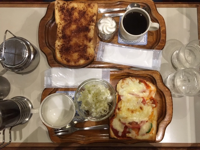 今回頼んだのは、私はピザトーストと紅茶、オットはシナモントーストと珈琲。