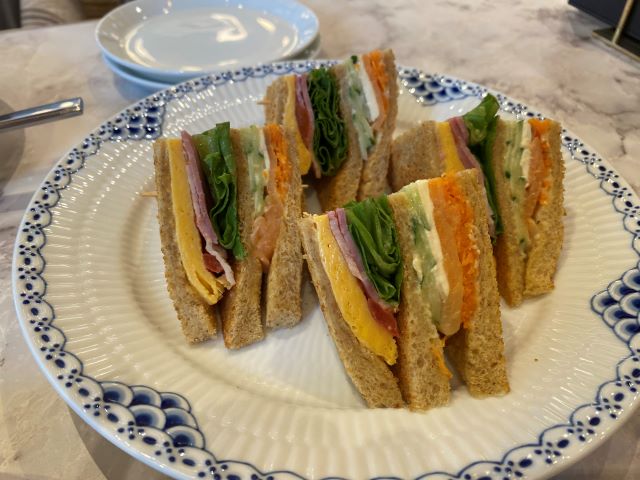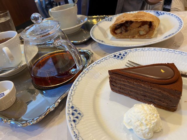 モーツァルトトルテは濃厚なチョコレートがモーツァルトブレンドティーととてもよく合い、美味しかった~!そしてそして、サーモンやクリームチーズが入っているライ麦パンのサンドイッチがこれまた美味しく、甘いものだけでなく、こっちも頼んでよかったね~と言い合ってパクパクと美味しく頂きました。アップルシュトゥルーデルが結構ずっしりと(そして甘め)量もあったので(ケーキもシェアしました)、かなり満腹になり、大満足のブランチとなりました。